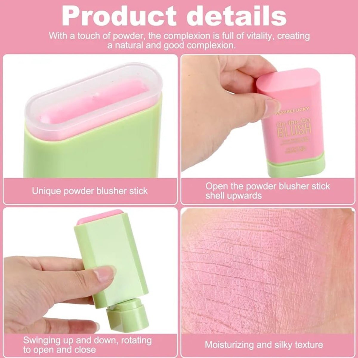 Enhance your natural beauty with MAYBELUCKY ON THE GO BLUSHER STICK. Its compact and convenient design allows you to effortlessly touch up your blusher on the go. Made with high-quality ingredients, this blusher stick provides a long-lasting and radiant glow. Achieve a flawless and fresh look anytime, anywhere.