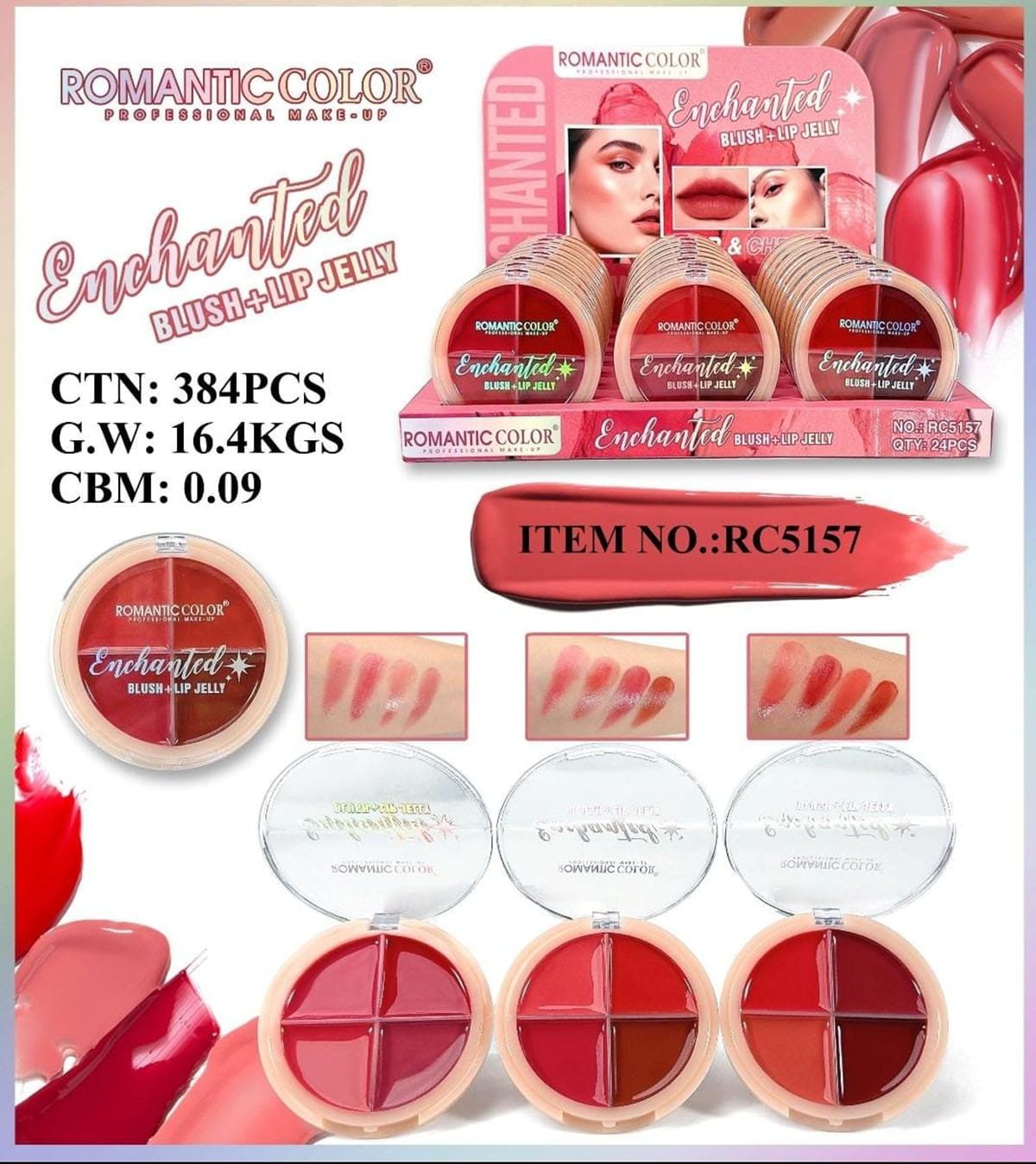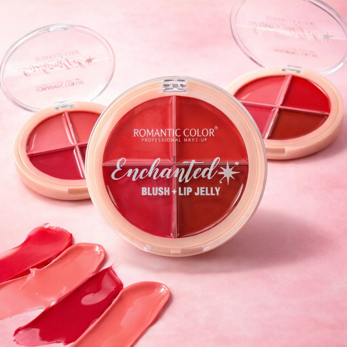 Discover a magical pop of color with the Romantic Color Enchanted Blush + Lip Jelly — a multi-use jelly cream palette designed for both lips and cheeks. This 4-shade compact features rich, glossy tints that blend smoothly into the skin, giving a fresh, dewy, and naturally flushed look.